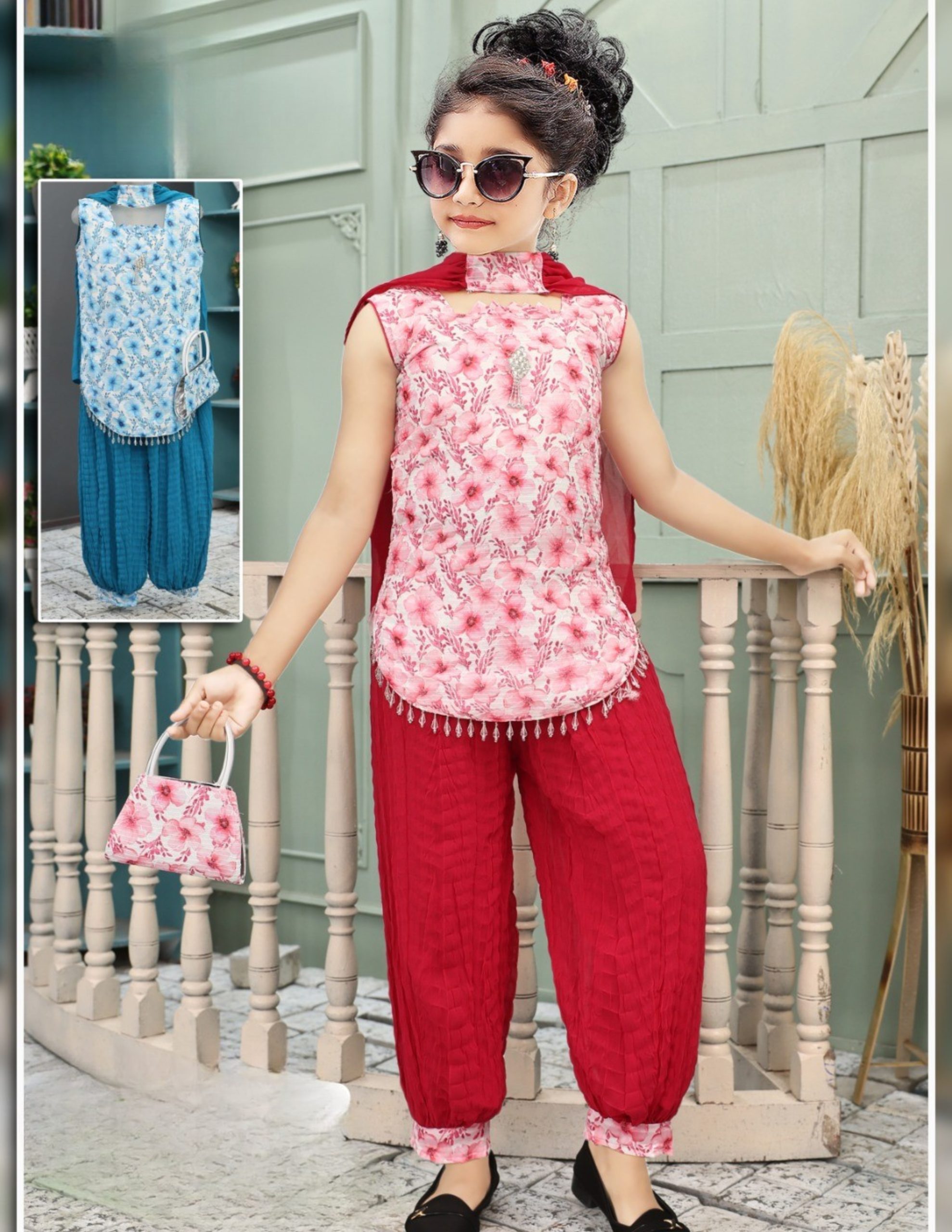 Design: Floral sleeveless kurti with bead-fringe detailing, pleated harem pants & matching purse