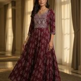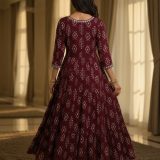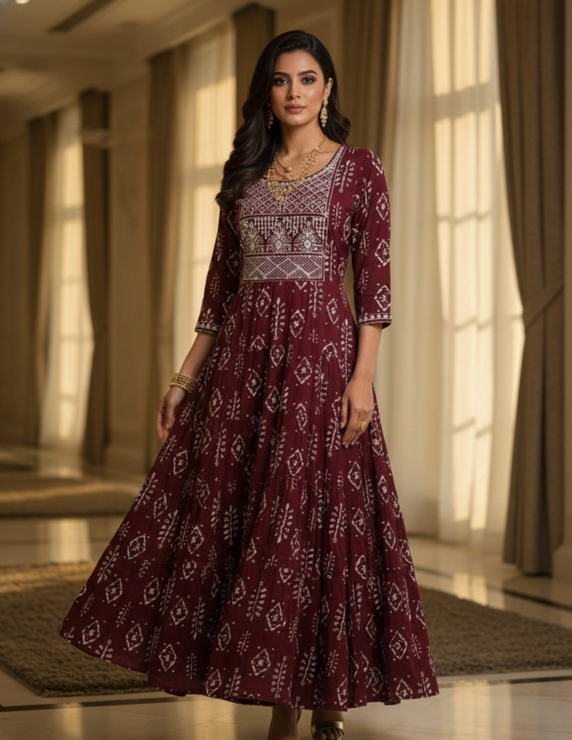 Design: Beautiful flared Anarkali kurti with all-over print and detailed white embroidery on yoke and 3/4 sleeves