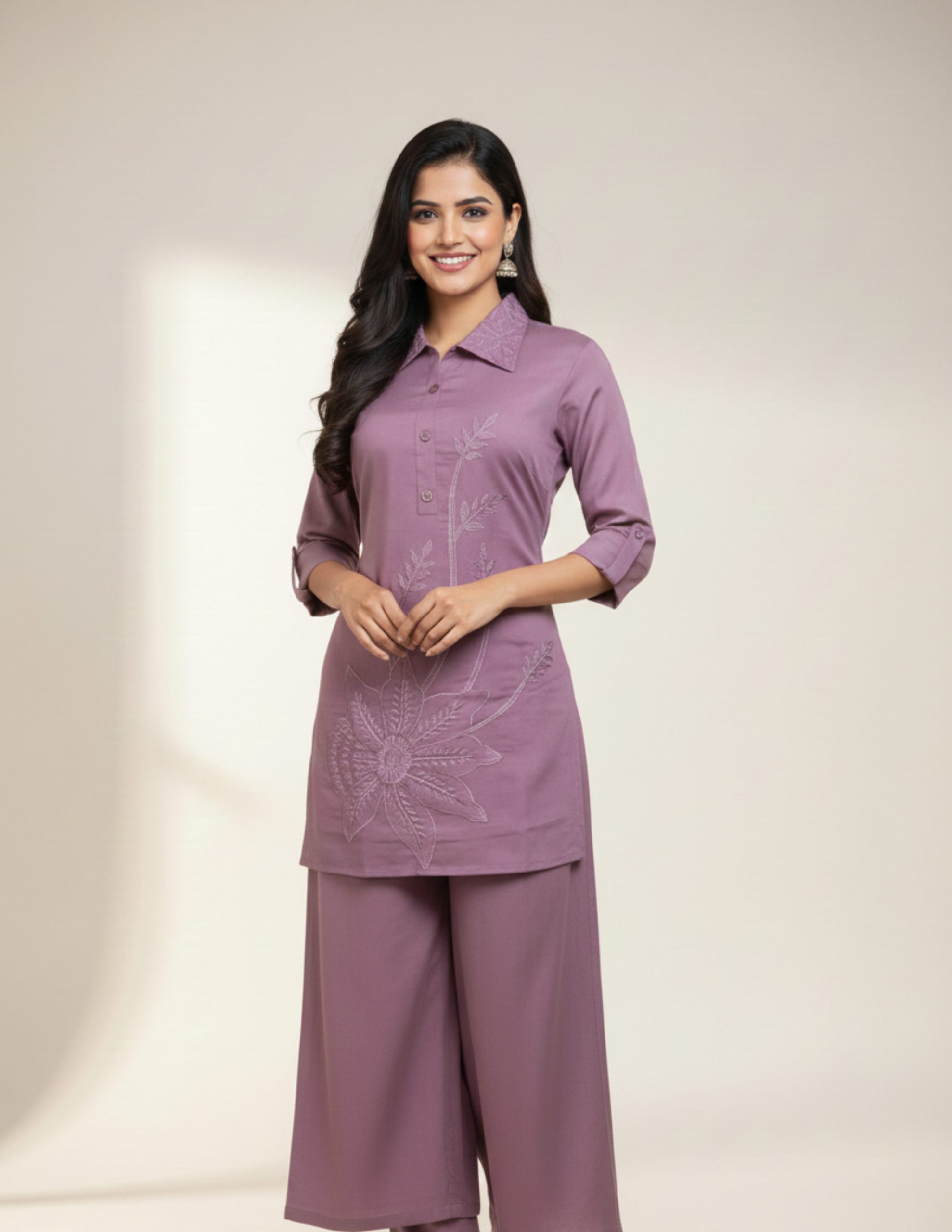 Design: Shirt-style short kurta with collar and elegant floral thread embroidery